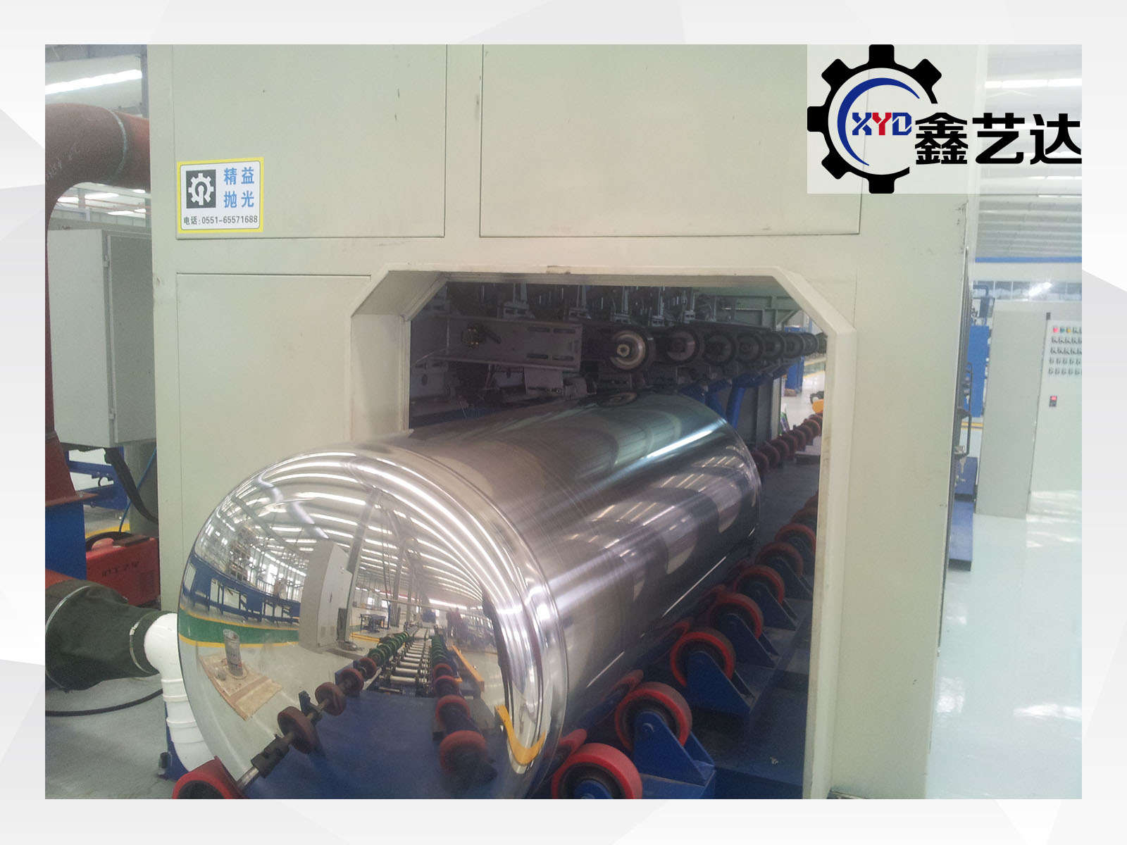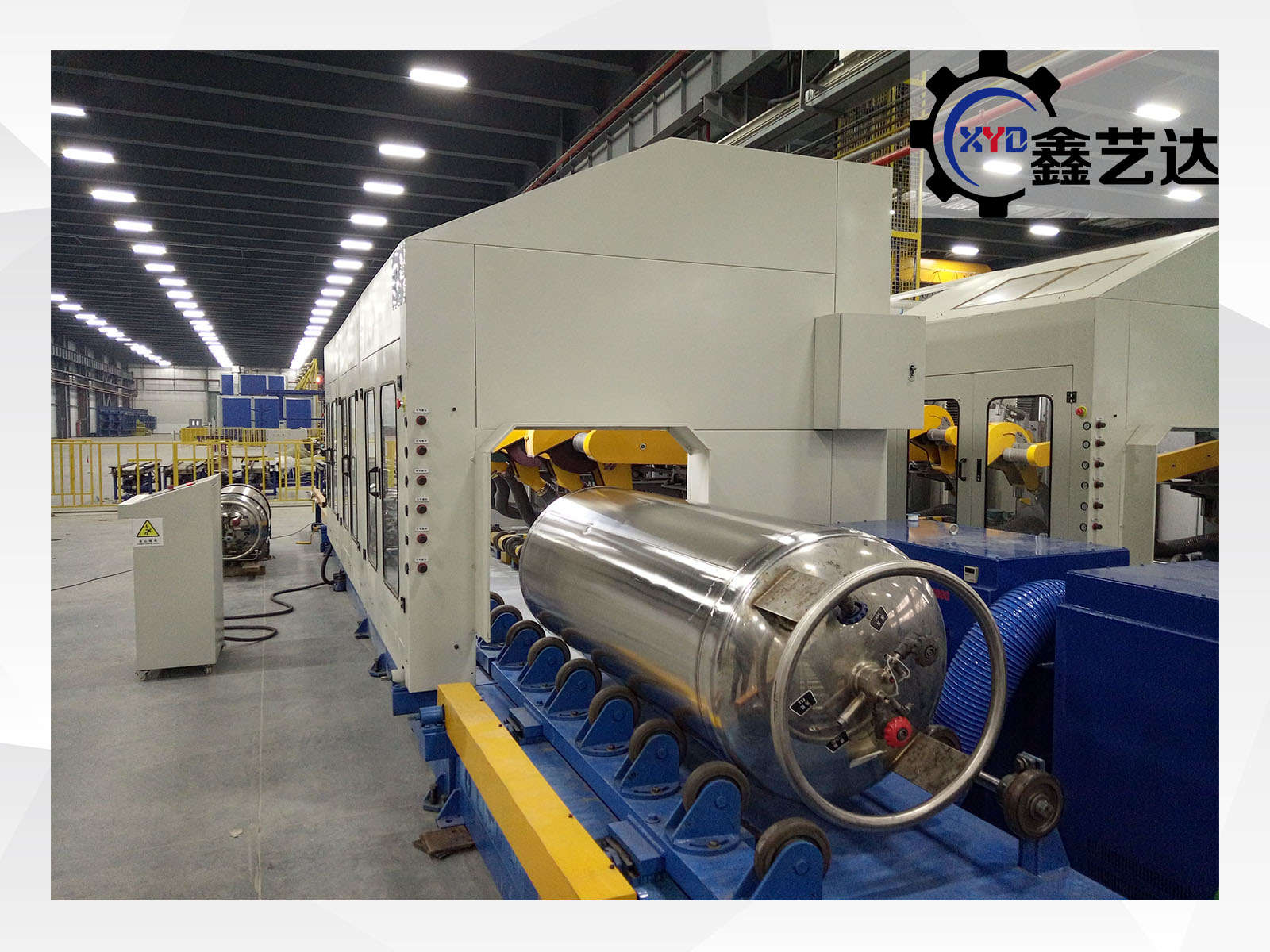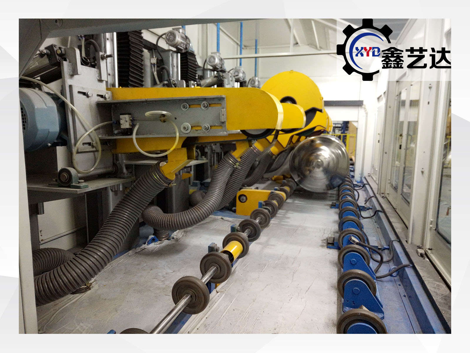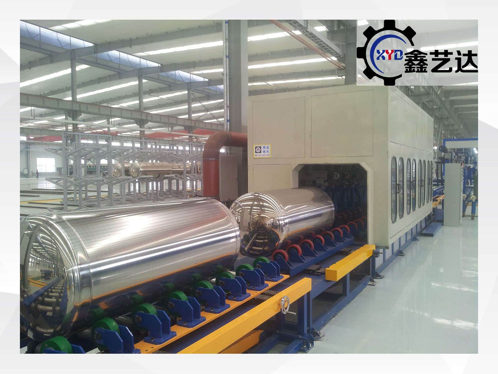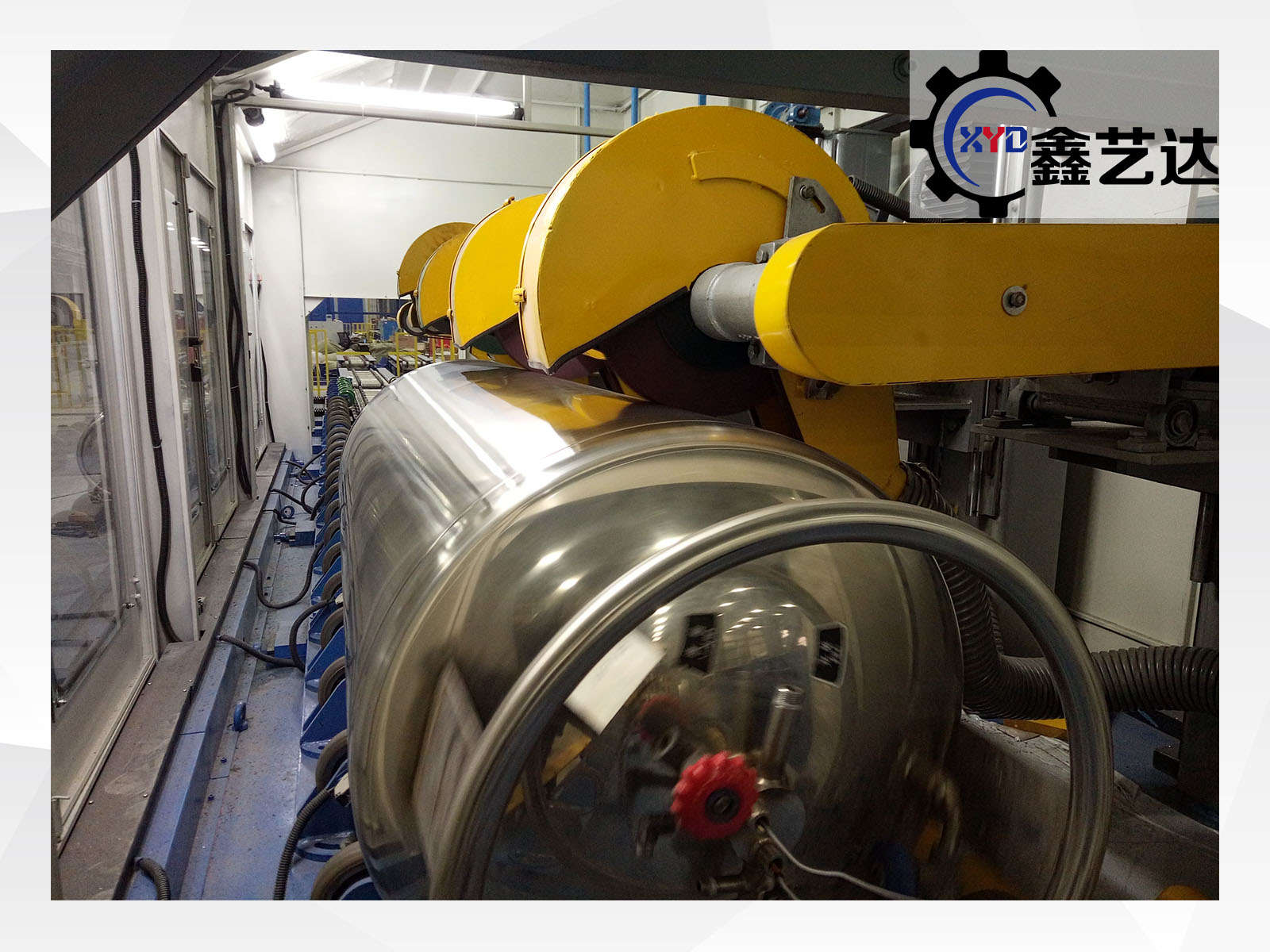 LNG氣瓶筒節(jié)外表面的拋光處理,設備與輸送線連接在一起,氣瓶通過輸送線進入筒體拋光機上料機構。筒節(jié)拋光采用臥式自動通過方式,由電機直聯(lián)減速機帶動滾輪旋轉(zhuǎn),從而帶動筒節(jié)螺旋前進。拋光頭采用電動絲桿預先調(diào)整好磨頭上下位置,同時需要手動絲桿調(diào)整從動輪的位置,以適應直徑大小不同的筒體,磨頭通過恒壓裝置預壓筒節(jié)表面,筒節(jié)在螺旋前進過程中,拋光頭不斷對筒節(jié)表面進行打磨,從而實現(xiàn)了筒節(jié)表面的拋光功能。