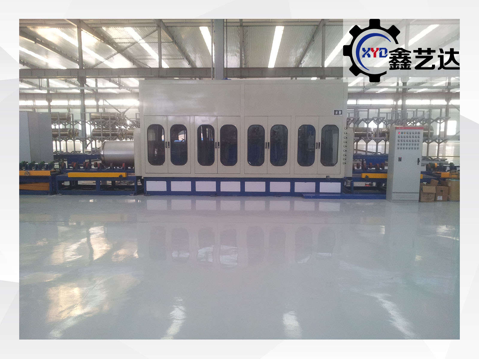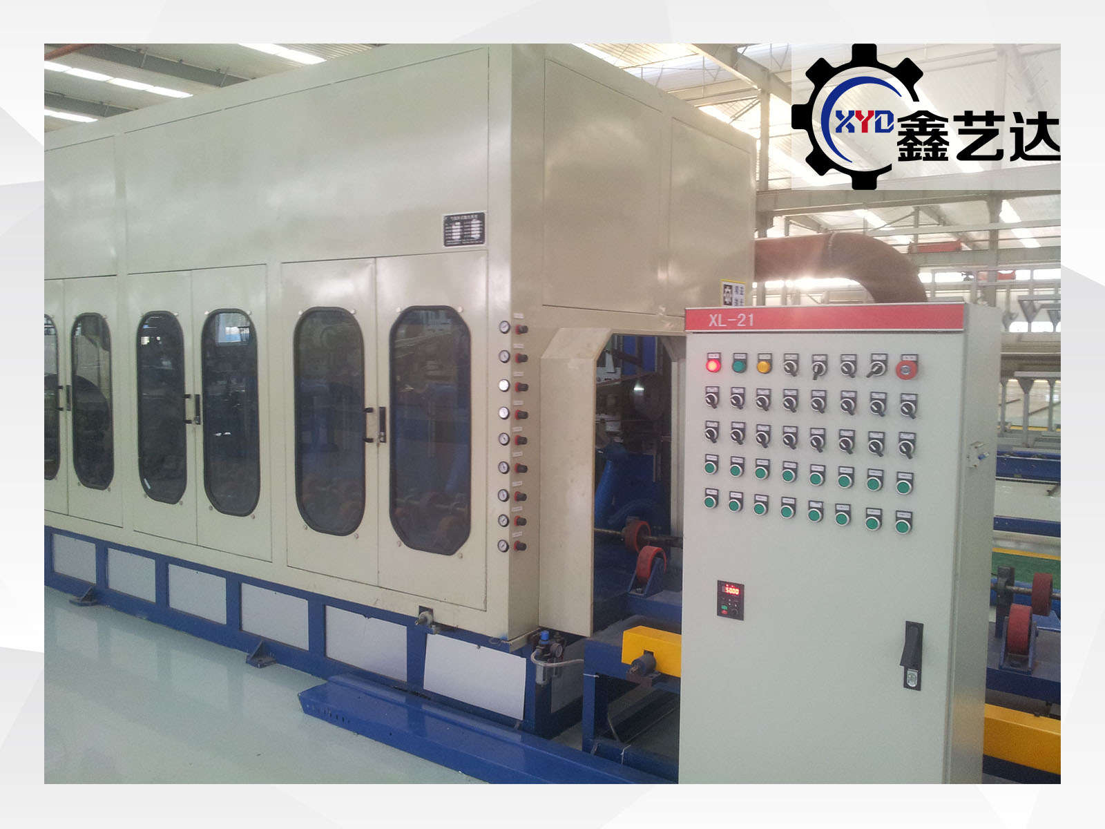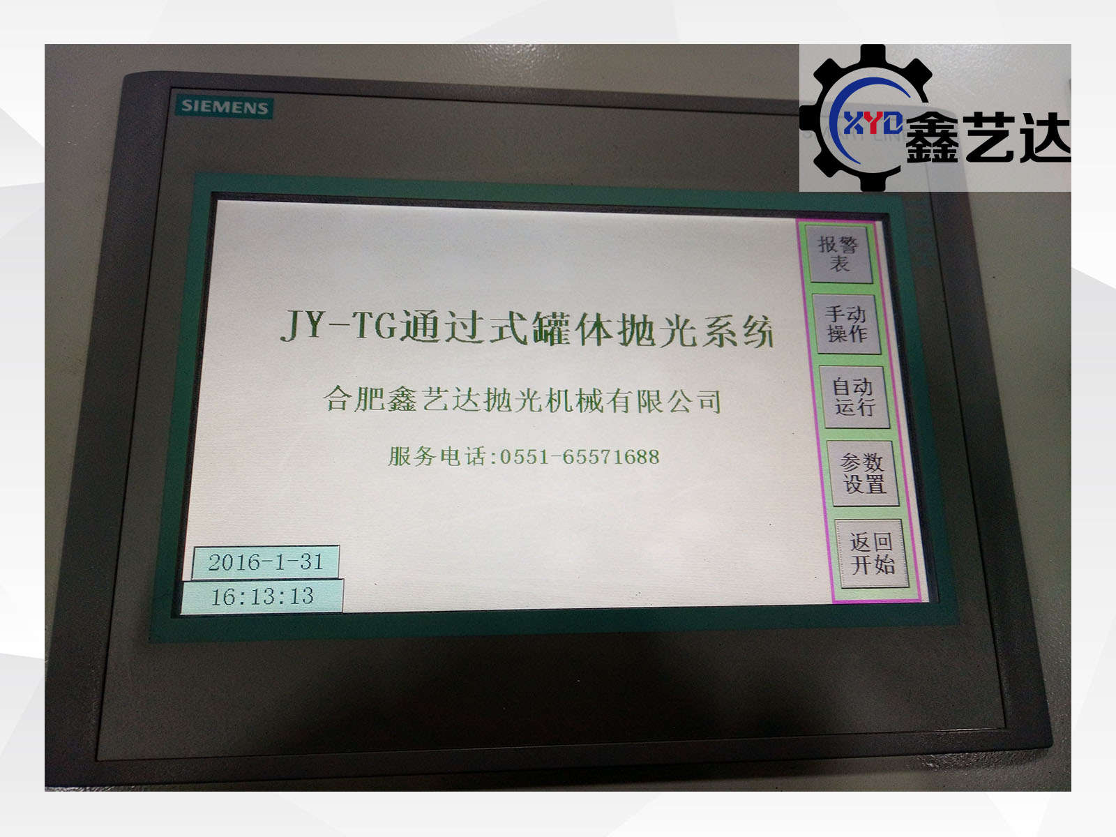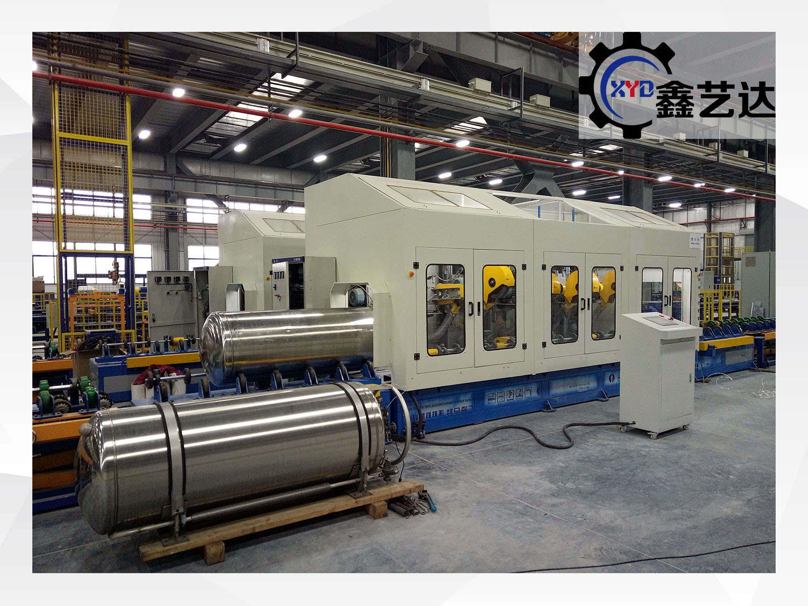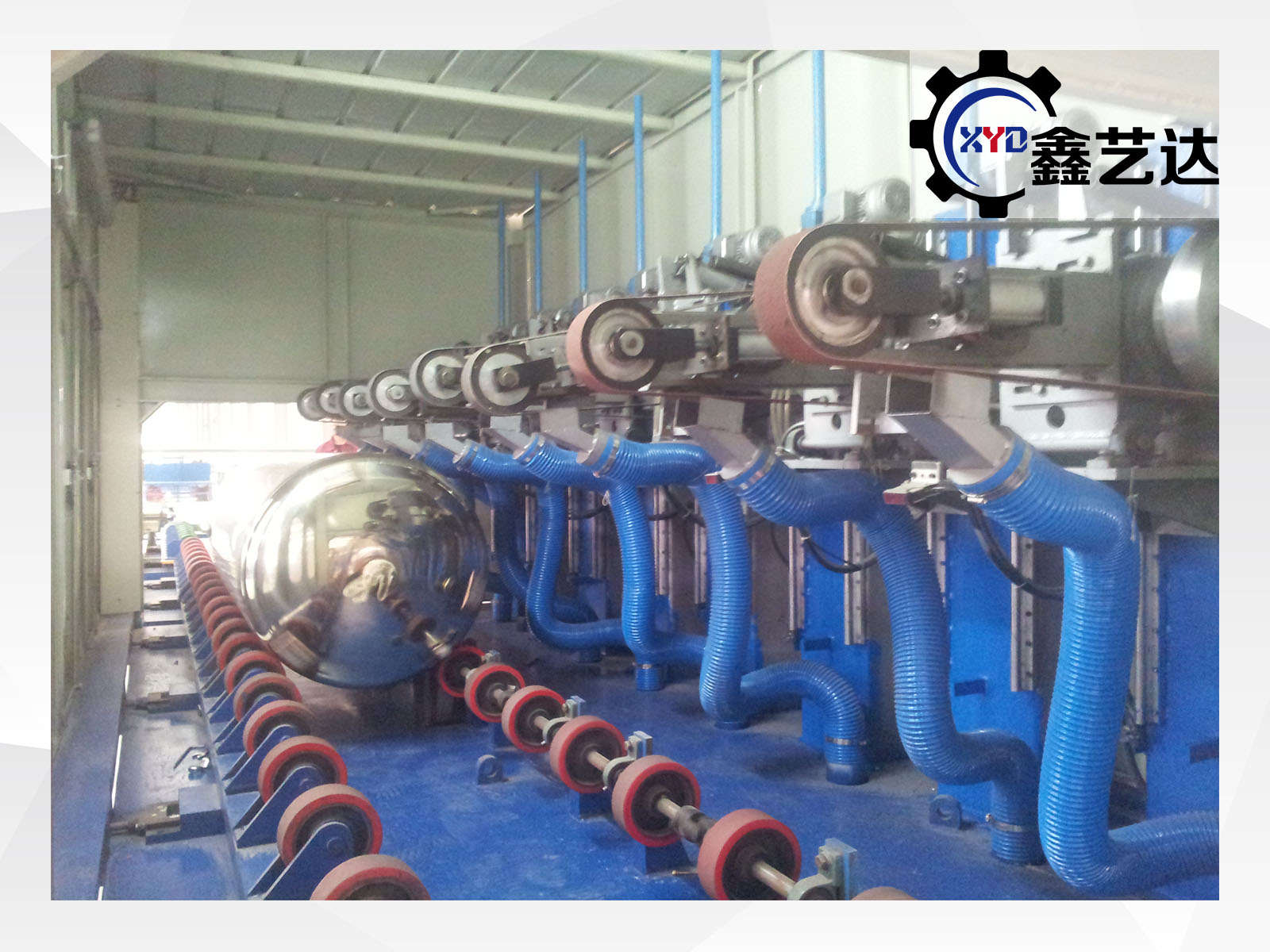 LNG氣瓶筒節(jié)外表面的拋光處理,設備與輸送線連接在一起,氣瓶通過輸送線進入筒體拋光機上料機構。筒節(jié)拋光采用臥式自動通過方式,由電機直聯(lián)減速機帶動滾輪旋轉(zhuǎn),從而帶動筒節(jié)螺旋前進。拋光頭采用電動絲桿預先調(diào)整好磨頭上下位置,同時需要手動絲桿調(diào)整從動輪的位置,以適應直徑大小不同的筒體,磨頭通過恒壓裝置預壓筒節(jié)表面,筒節(jié)在螺旋前進過程中,拋光頭不斷對筒節(jié)表面進行打磨,從而實現(xiàn)了筒節(jié)表面的拋光功能。