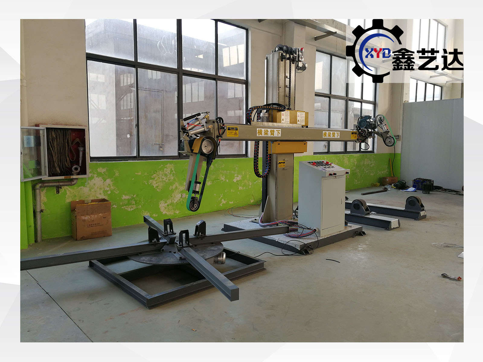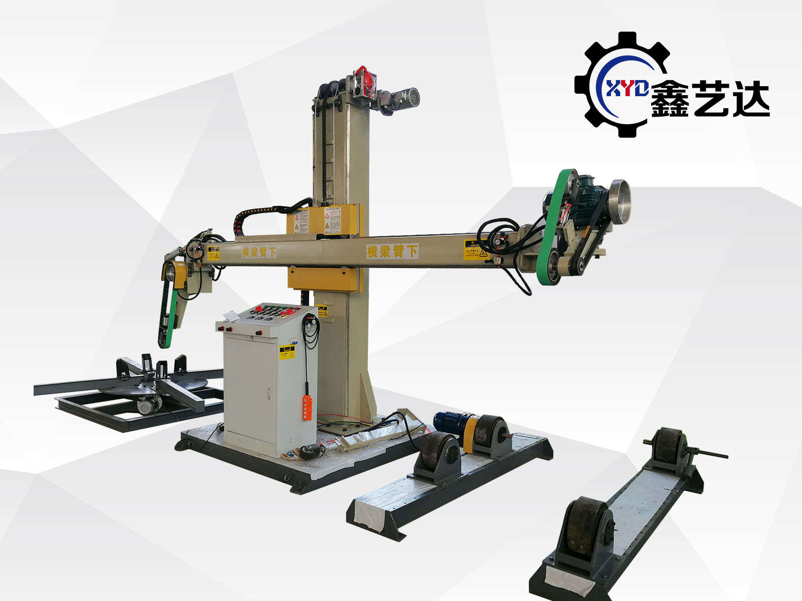 標(biāo)配載重1噸的罐體滾臺(tái),載重1噸的封頭轉(zhuǎn)臺(tái),橫梁上下、左右、工件旋轉(zhuǎn),變頻調(diào)速,一共三臺(tái)變頻器(滾臺(tái)、轉(zhuǎn)臺(tái)共用、轉(zhuǎn)換開(kāi)關(guān)控制),橫梁有效行程2500mm